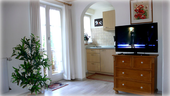 mit Couchgarnitur, Kabel-TV und Stereo-Radio Blick vom Wohnraum zur Küche |
