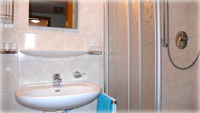 Bad mit Duschkabine und Waschbecken. Fön.
