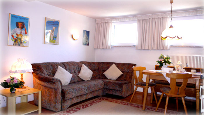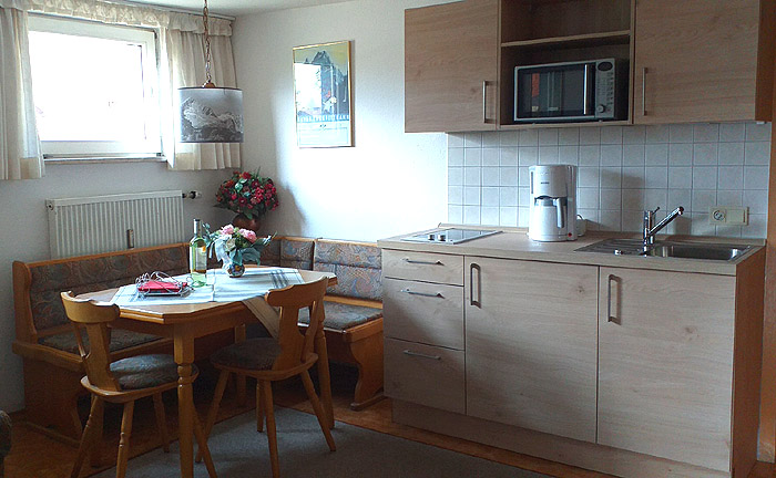 Südbalkon mit Balkonmöbel und herrlicher Aussicht auf Alpspitze, Waxensteine und Zugspitze. Gemütlicher Wohnraum mit Couch, Essplatz, Flachbild-Kabel-TV und Stereo-Radio. Küchenzeile mit 2-Platten-Herd, Mikrowelle, Kaffeemaschine, Wasserkocher, Toaster, Eierkocher und Kühlschrank. Schlafzimmer mit Doppelbett. Schlafzimmer mit zwei Einzelbetten. Zentralheizung.